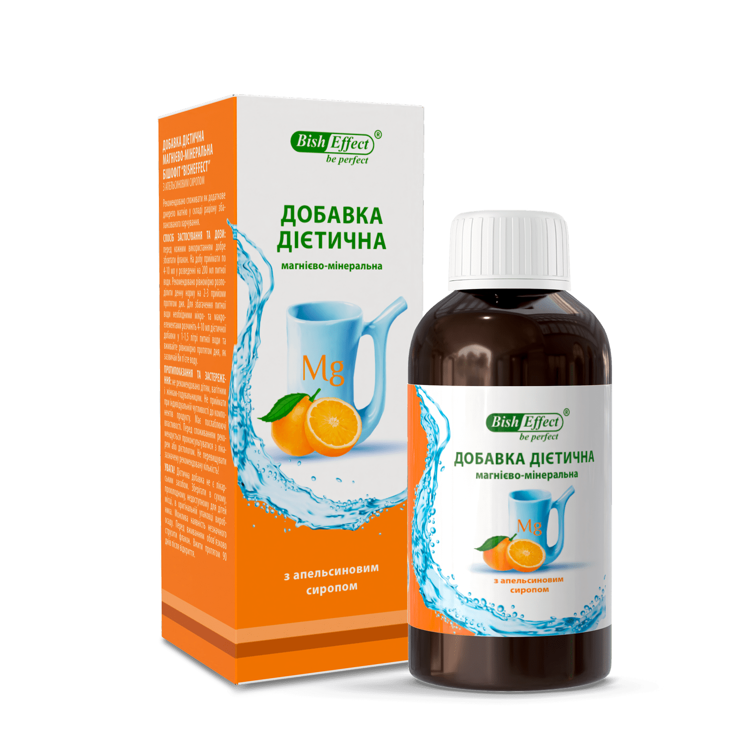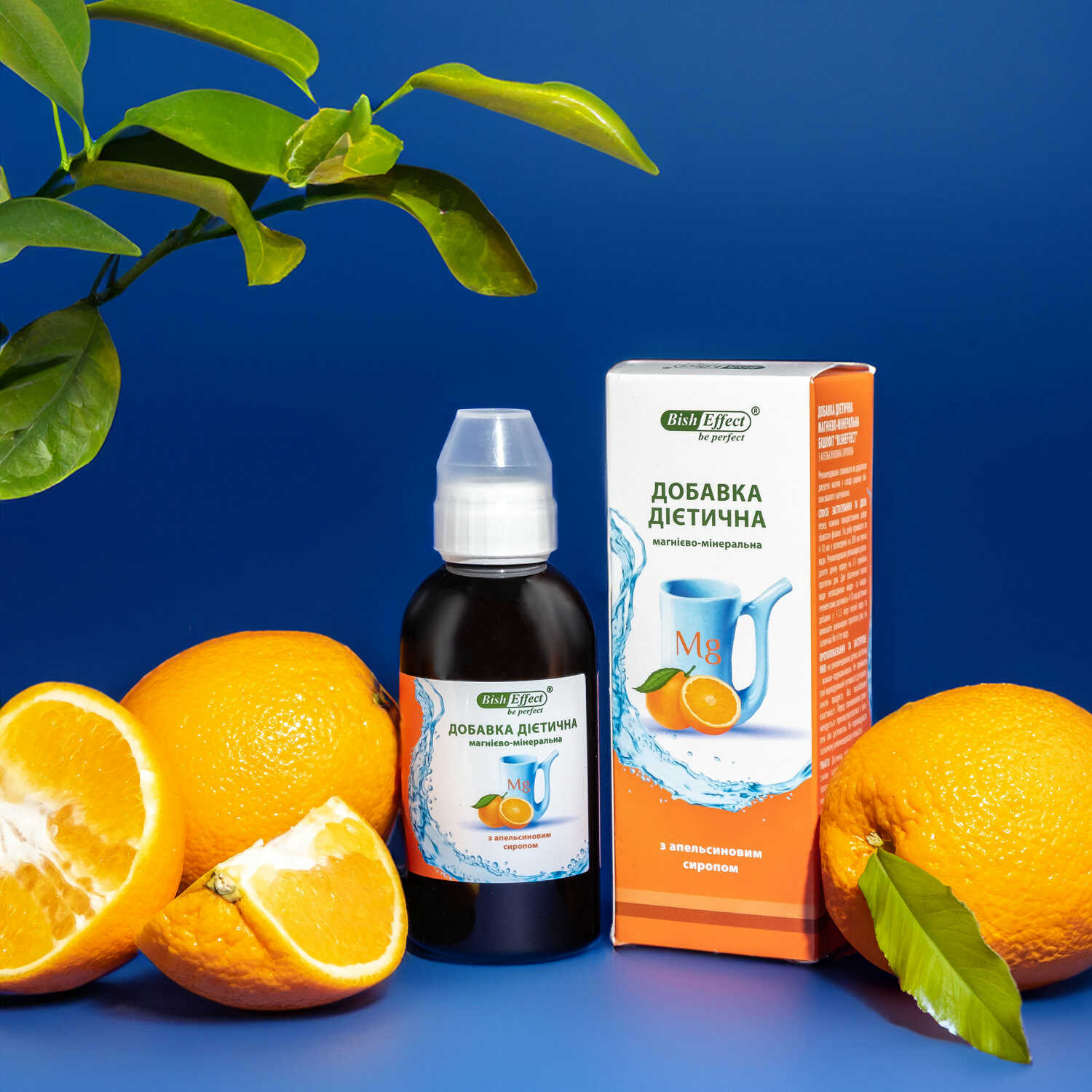Це рідка дієтична добавка на основі природного мінералу бішофіту, збагачена апельсиновим сиропом для покращення смаку та приємного аромату. Засіб розроблений як додаткове джерело магнію в раціоні харчування, особливо в умовах підвищеного навантаження чи нестачі мікроелементів у повсякденному меню.