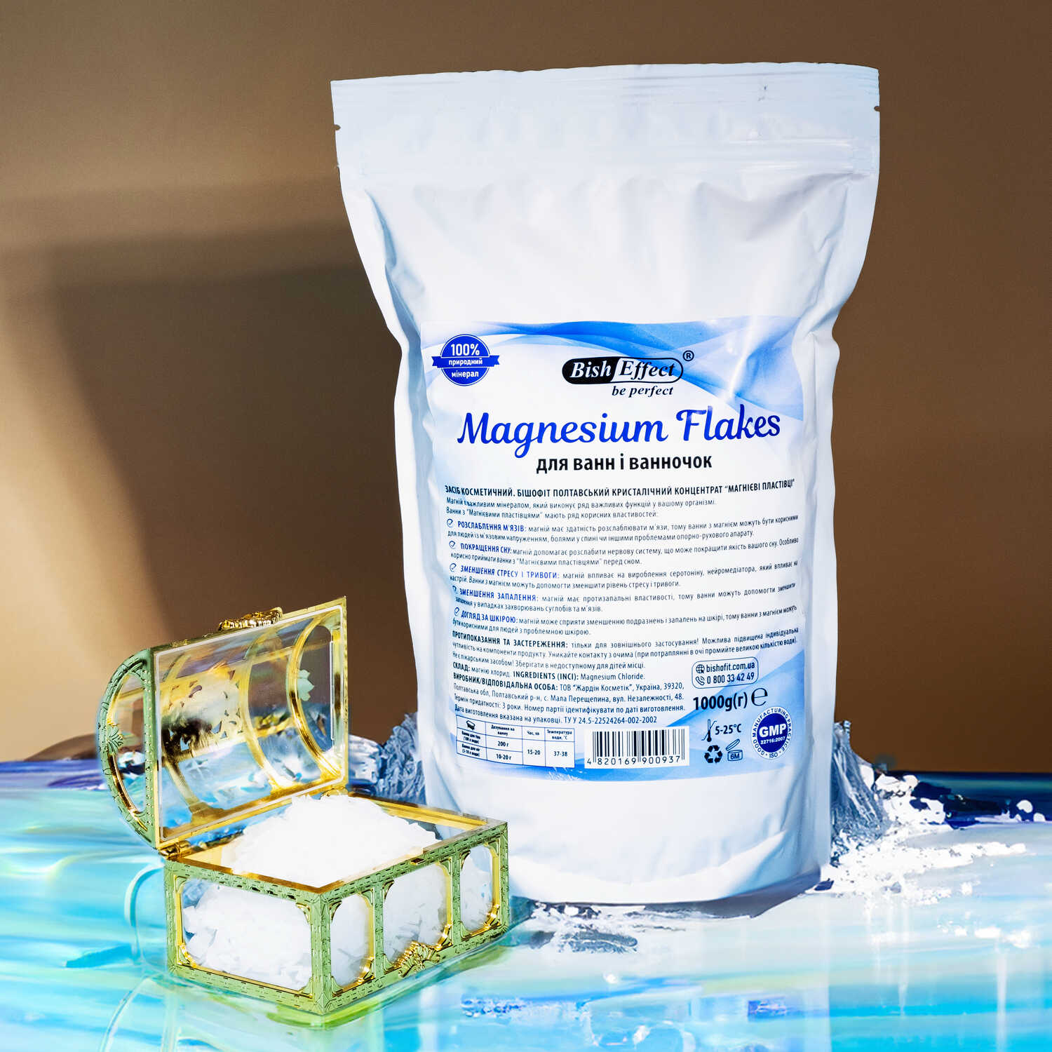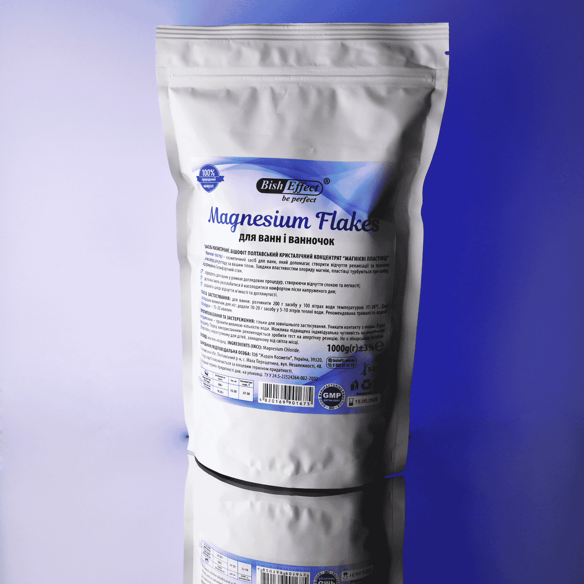 Магнієві пластівці – це косметичний засіб для ванн, виготовлений на основі хлориду магнію (відомого як бішофіт), який допомагає створити атмосферу релаксації та забезпечує комфортний догляд за шкірою. Цей продукт розроблений для тих, хто хоче подарувати собі хвилини спокою після насиченого дня, фізичних навантажень чи просто для того, щоб насолодитися приємною процедурою вдома. Пластівці легко розчиняються у теплій воді, наповнюючи ванну корисними мінералами, які ніжно обволікають шкіру, роблячи її гладенькою, зволоженою та доглянутою. Завдяки властивостям бішофіту цей засіб не лише піклується про зовнішній вигляд шкіри, але й створює відчуття легкості й оновлення, ніби ви щойно провели час на природі, вдихаючи свіже повітря.