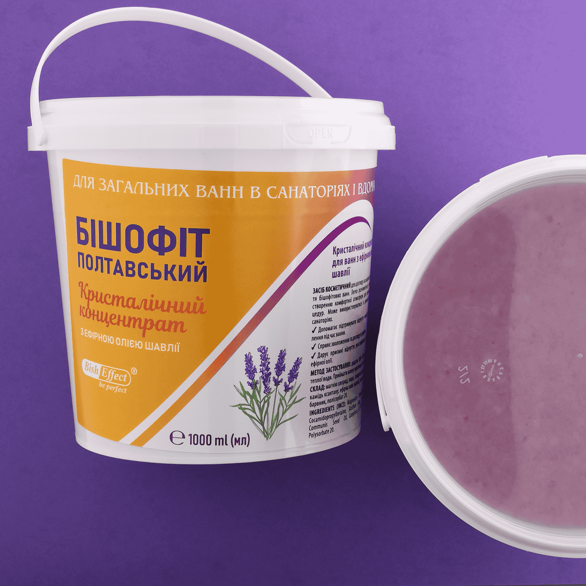 Бішофіт — природний мінерал, який використовується у складі косметичних продуктів для догляду за шкірою під час водних процедур. Під час використання засобів з бішофітом шкіра після ванни сприймається більш м’якою та гладкою. Мінеральна основа бішофіту підкреслює косметичний характер догляду та робить водні процедури більш збалансованими. Завдяки природному походженню він гармонійно поєднується з ефірною олією шавлії, що дозволяє використовувати засіб у регулярних процедурах без перевантаження складу. Контакт із водою стає делікатним, що дозволяє уникнути відчуття сухості або стягнутості.